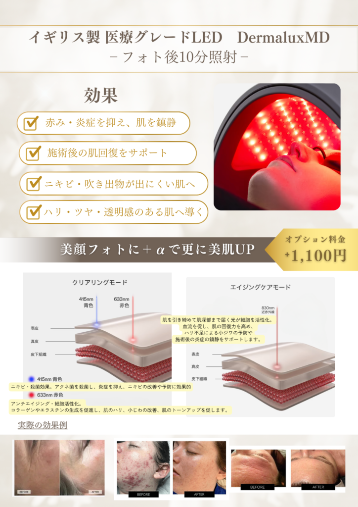 このスペシャルケア、美顔フォトのメニューに+1,100円(税込)で追加可能です!