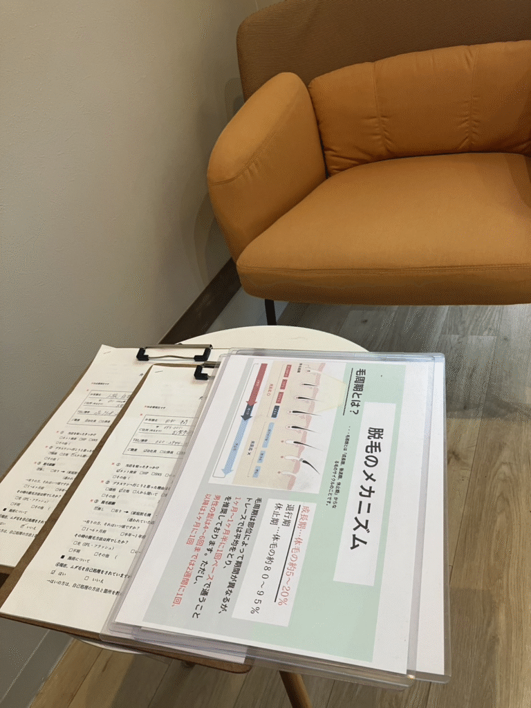 初めてのカウンセリングでは、毛周期や脱毛の仕組みについてしっかりご説明させていただき、安心して施術を受けていただけました。